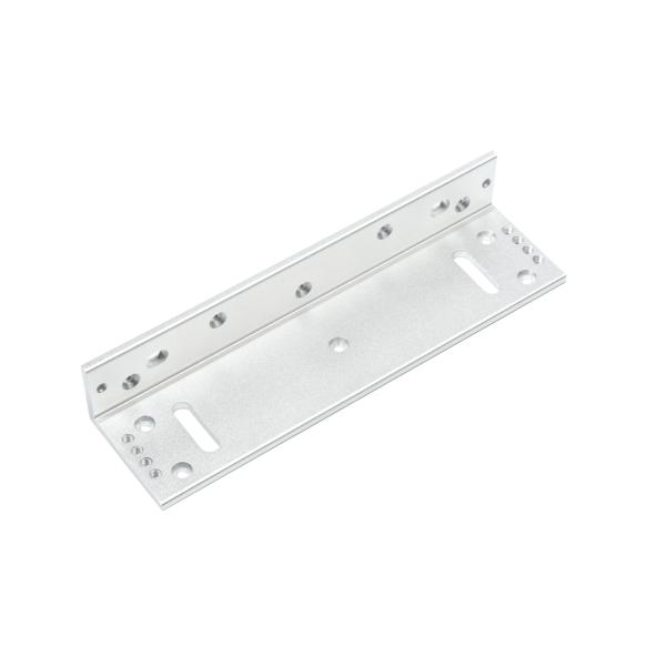 Suport ABK-500L inoxidabil din duraluminiu pentru montarea electromagnetilor de 500 kgf la usi cu tocul ingust. Acest produs este utilizat pentru modelele: YM-500(LED), YM-500BZ. Montarea se face aplicat la usi cu tocul ingust si deschidere in exterior. Electromagnetul se monteaza aplicat pe tocul usii cu ajutorul acestui suport L, iar contraplaca se monteaza direct pe usa.