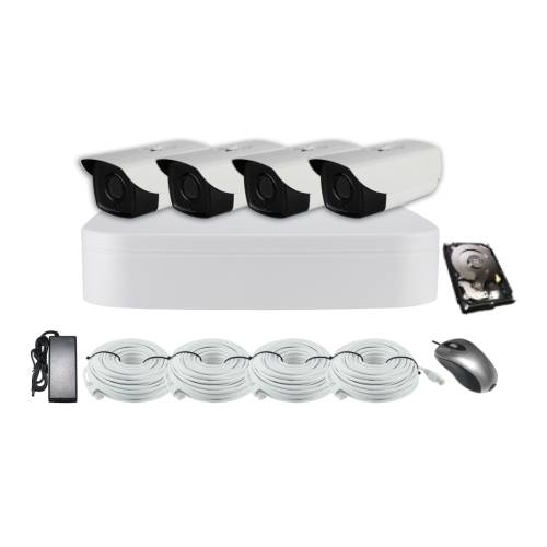 Set NVR HD 4 canale si 4 camere de supravegherre IP full HD pentru exterior cu lentila 3 Mpx de 6 mm , distanta IR 60 metri . Kitul mai contine 4 cabluri mufate de retea UTP CAT5 cu o lungime de 18 metri , HDD de 2 TB .