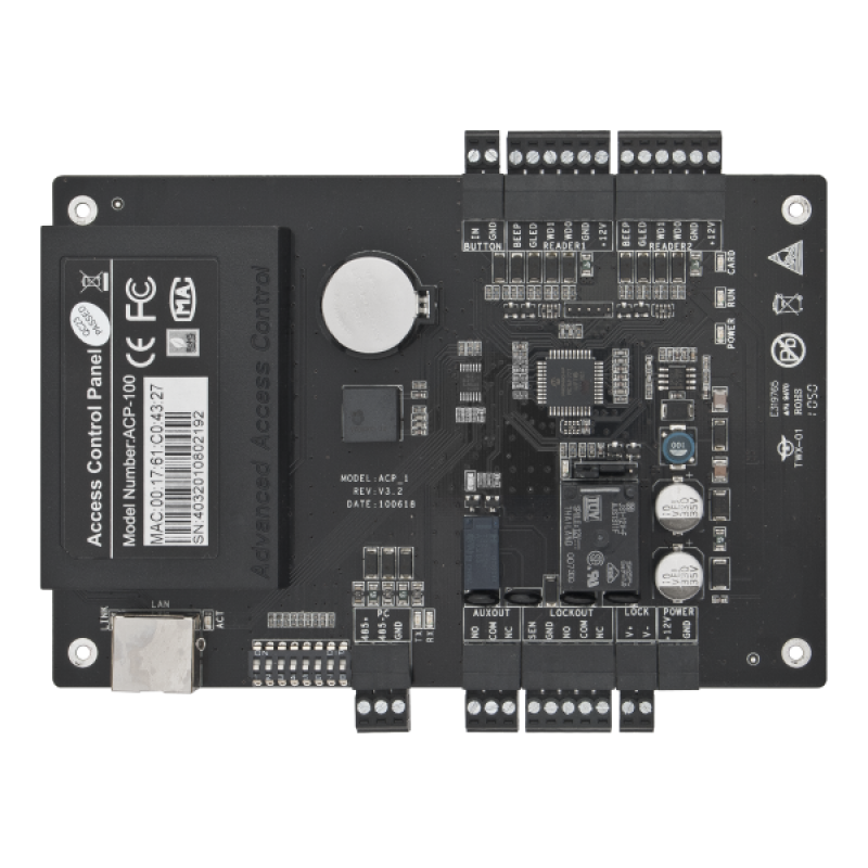 Centrala de control acces TCP/IP CCA3-1-2. Are o aplicatie de tip server inclusa, intrari si iesiri auxiliare ce pot fi programare, deschidere multicartela, interlock, duress, anti-passback, alimentare pentru yale etc.