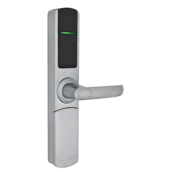 Semonteaza pe orice broasca cu interax de 70, 72, 85, 90 sau de 92 mm. Aceasta incuietoare include un cilindru cu cheie blocabil din interior cu buton. Nu include broasca si este compatibila cu zavoare deja instalate pe usa. Bateriile se schimba din exterior prin demontarea capacului. Functioneaza cu cartele RFID de tip Mifare S50.