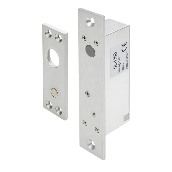 Minibolt electric SL-136B incastrabil cu monitorizare, temporizare si contact pentru buton. Poate fi folosit in sisteme de control acces pentru usi cu deschidere de 90º~180º din metal sau lemn.